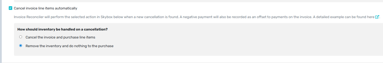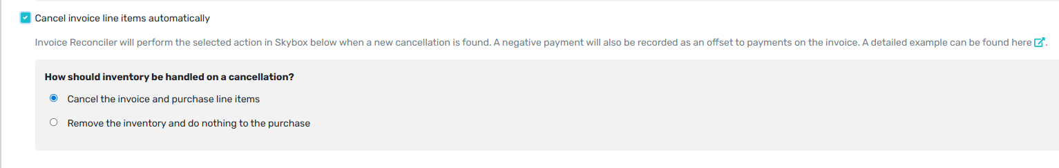 - Cancel invoice line items automatically - Reveal can update the cancellation in SkyBox for you automatically. This saves you the time and effort of manually processing. For Reveal to process, you must choose how the inventory will be handled on the cancellation. This selection is made for each marketplace. Go to Credentials and click on the marketplace tile. Then, select from one of two choices: